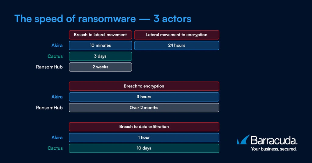 Ransomware attacks are an excellent example. According to Barracuda Managed XDR’s detection and incident data, the fastest ransomware attacks in 2025 took just hours end-to-end, while the longest took months. Lengthy intrusions allow for maximum damage, and incidents that move at lightning speed can be harder to catch and contain before they’ve been executed.