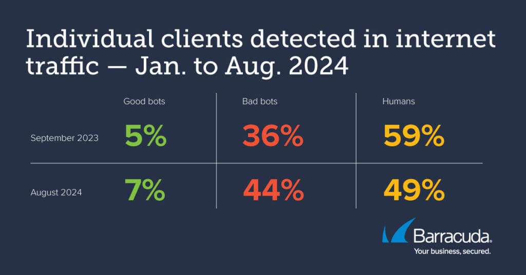 Barracuda security researchers analyzed bot-related traffic and activity targeting web applications and APIs between September 2023 and the end of August 2024. Among other things, the researchers found that: