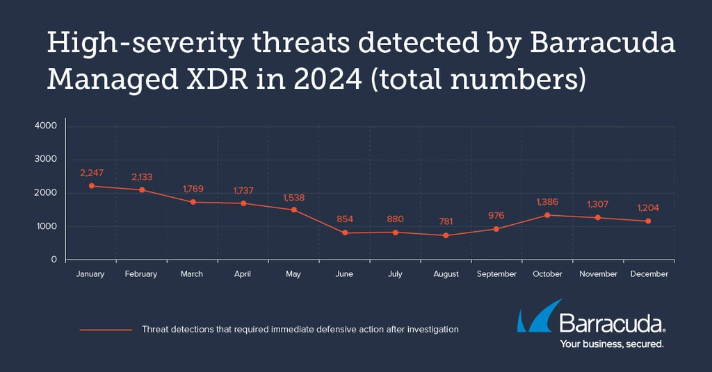 The level of high-severity threats mitigated by Barracuda Managed XDR — the ones that required immediate defensive action — remained relatively consistent throughout 2024, with roughly 1,000 to 2,000 each month.